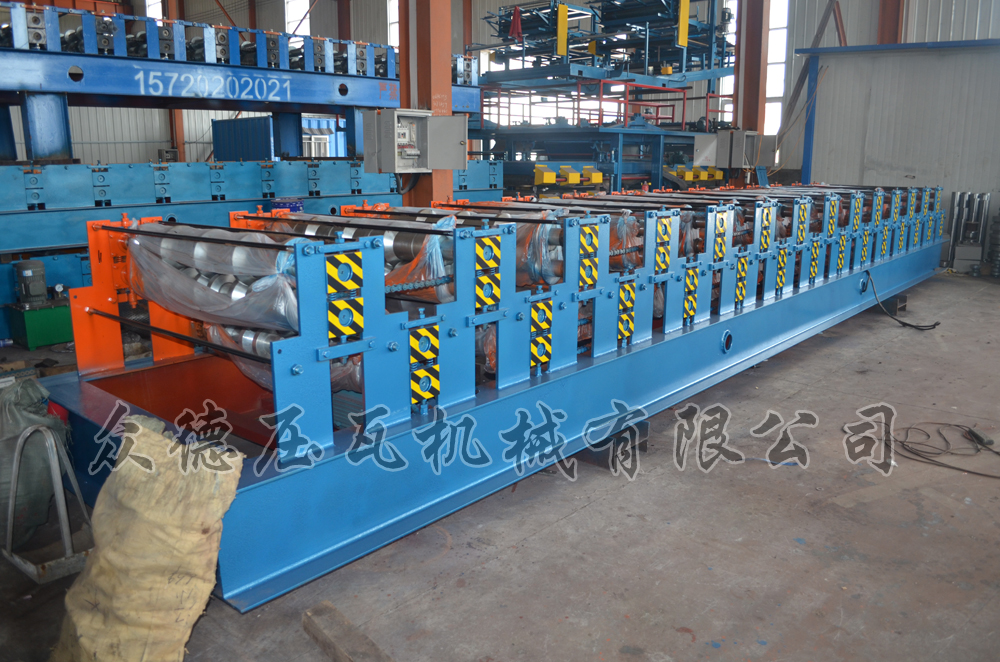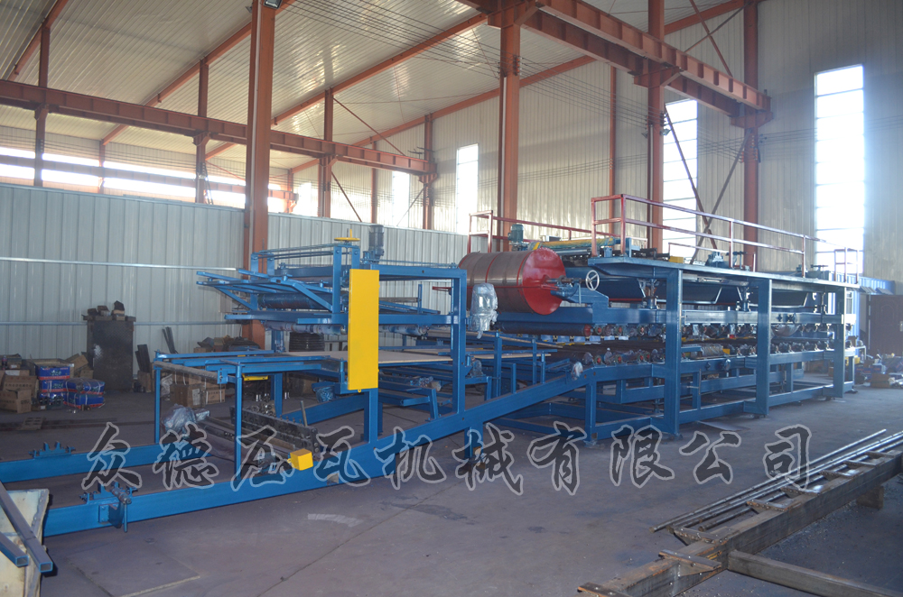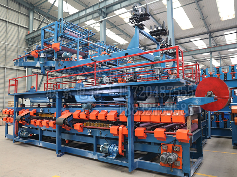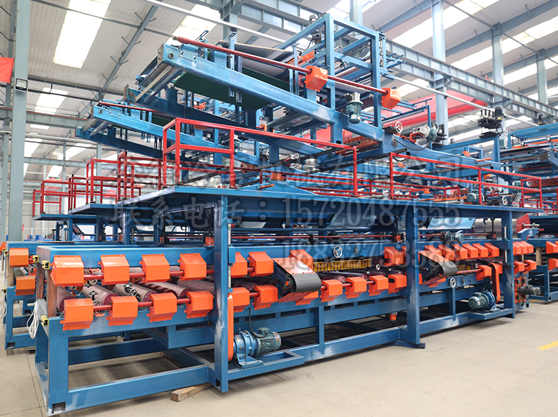 复合主机机组:把上下两层彩钢板用胶水复合在EPS或岩棉上。 复合主机由主机架、放卷装置、匀胶机构、纠偏装置、电加热装置、吸尘装置、电控装置。 ① 主机架:复合主机的机架是框架结构,共有上下小三副压轮架,每副压轮架上装有数对橡胶滚轮,上下橡胶滚轮在同一水平面,生产瓦楞板时小压轮架上升,然后放入配备的垫块。生产平板时只须将垫块拿走即可。 ② 放卷装置:主机设有上、彩钢板放卷装置,刹车采用摩擦片方式,调节其上、彩卷板的张紧力,使其保持适度。 ③ 匀胶机构:主机设有上、滴胶匀胶机构,本彩钢复合板生产线采用计量泵输送胶水,胶水通过滴胶管均匀的 滴在上、彩板上,在由匀胶机构将两种胶水均匀混合,滴胶、匀胶方式与喷胶方式相比结构简单,而且减少了空气污染,减轻了工人的劳动强度。 ④ 纠偏装置:主机设有两套纠偏装置,即上下纠偏装置,上纠偏机构采用大直径不锈钢滚筒,并能调整宽度。下纠偏装置采用螺纹调节,简单。 ⑤ 电加热装置:主机上设有红外线电加热装置6套,为设备在较低温度下,可以产出的复合板。 ⑥ 吸尘装置:利用吸风机将生产过程中切削废料吸入吸尘装置中. ⑦ 电控装置:主机电控由交流接触器和变频器组成,其中主机速度和胶泵速度均由变频调速控制,它还可和瓦楞机组成一个同步机构,实现两者间的速度统一,为生产的产品提供了。