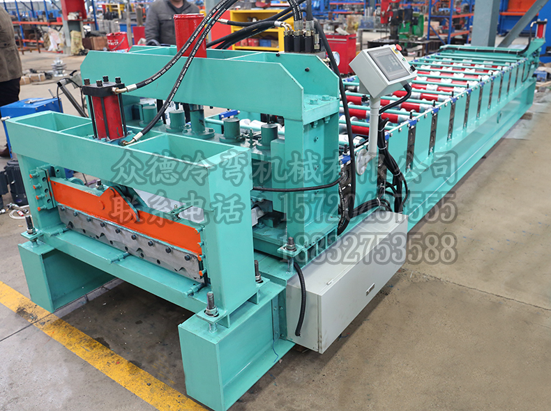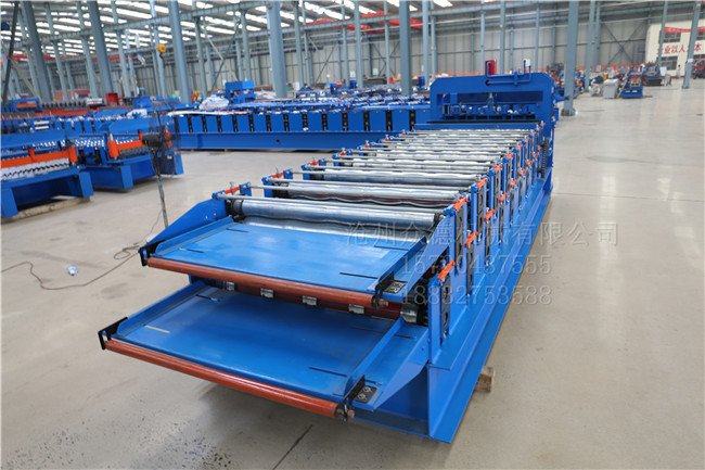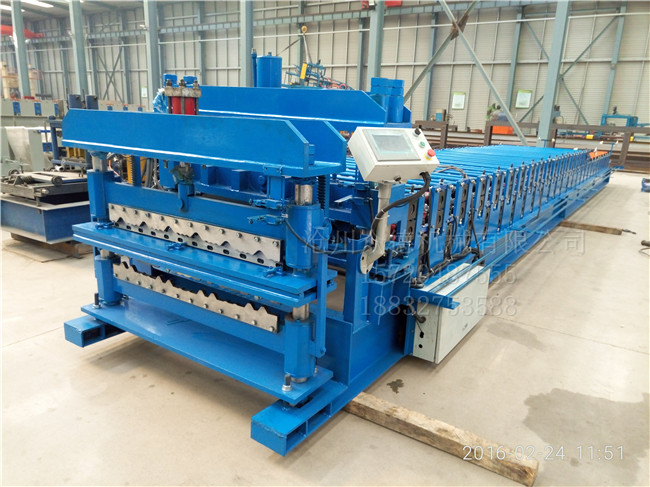 描述:此款双层琉璃瓦压型机器,为一机双型号琉璃瓦压型机,上层加工琉璃瓦,下层加工普通墙面瓦;电机的主功率为4KW,带动力强,该机器的滚轮采用机床加工而成,每个工件的精度!机器组装由钳工,水平测量组装??刂破魑狿LC电脑控制器,加工板材的厚度为0.2-0.8mm,全自动液压模具自动切断,生产,操作简单。