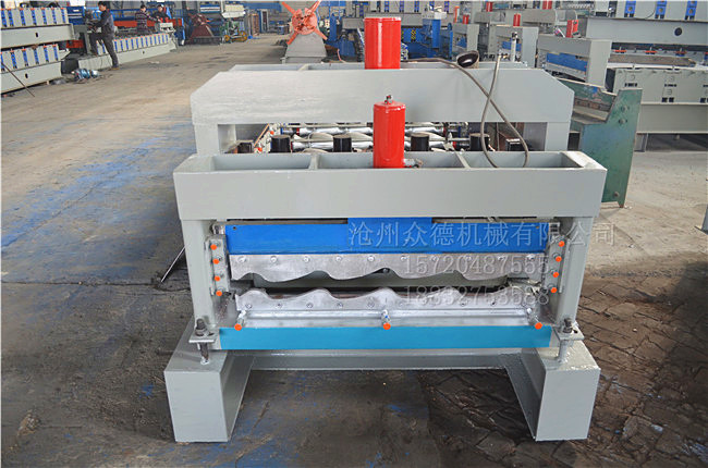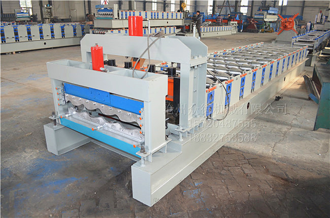 :众德机械 名称:828偏弧琉璃瓦设备 用途:用于加工金属板琉璃瓦 电机功率:4kw 机器重量:4T 剪切方式:液压切断 传动方式:链轮+链条传动 外形尺寸:7800*1500*1500mm 加工板材厚度:0.2-0.8mm PLC控制器:采用 全自动角驰828型偏弧琉璃瓦压瓦机,设备主要由装料架,装料架支座,进料导入平台,校平装置,压型主机,定型装置,成型剪切装置,液压泵站,全数控电脑自动控制柜等几部分组成.